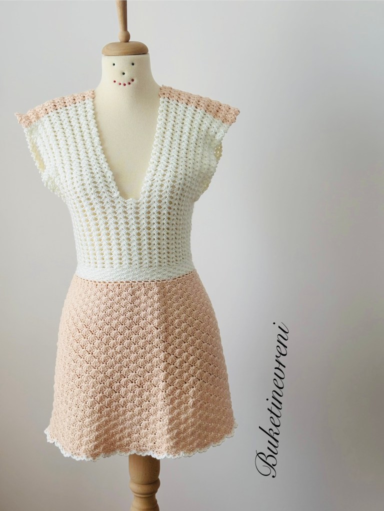 Üst tarafını viskon iplerle, etek kısmını koton iplerle ördüğüm bir model.